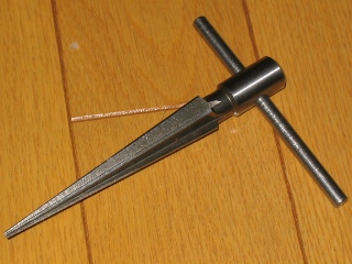 これがKWNに借りた便利アイテムです。 4mmの穴にコイツを差し込んで、 グリグリ地道に10mmにしました。 筋肉痛だよ〜 名前は不明だが、コイツは使えます! |