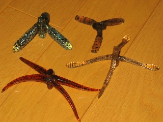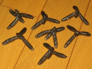 先日の笹川でアクションゲイラを使いまくった為、気が付いたら残り1個になっていた。 しかも、とりあえずテトラ型に組み合わせれば・・・と淡い期待を持って作成した アクションデビルが失敗作だったので、再度、なんちゃってアクションゲイラにトライ! 前回の失敗を踏まえ、まずは本家アクションゲイラを観察・・・なるほどね〜 ある点に気が付く・・・ さっそく要らないワームでプロトを作成! |